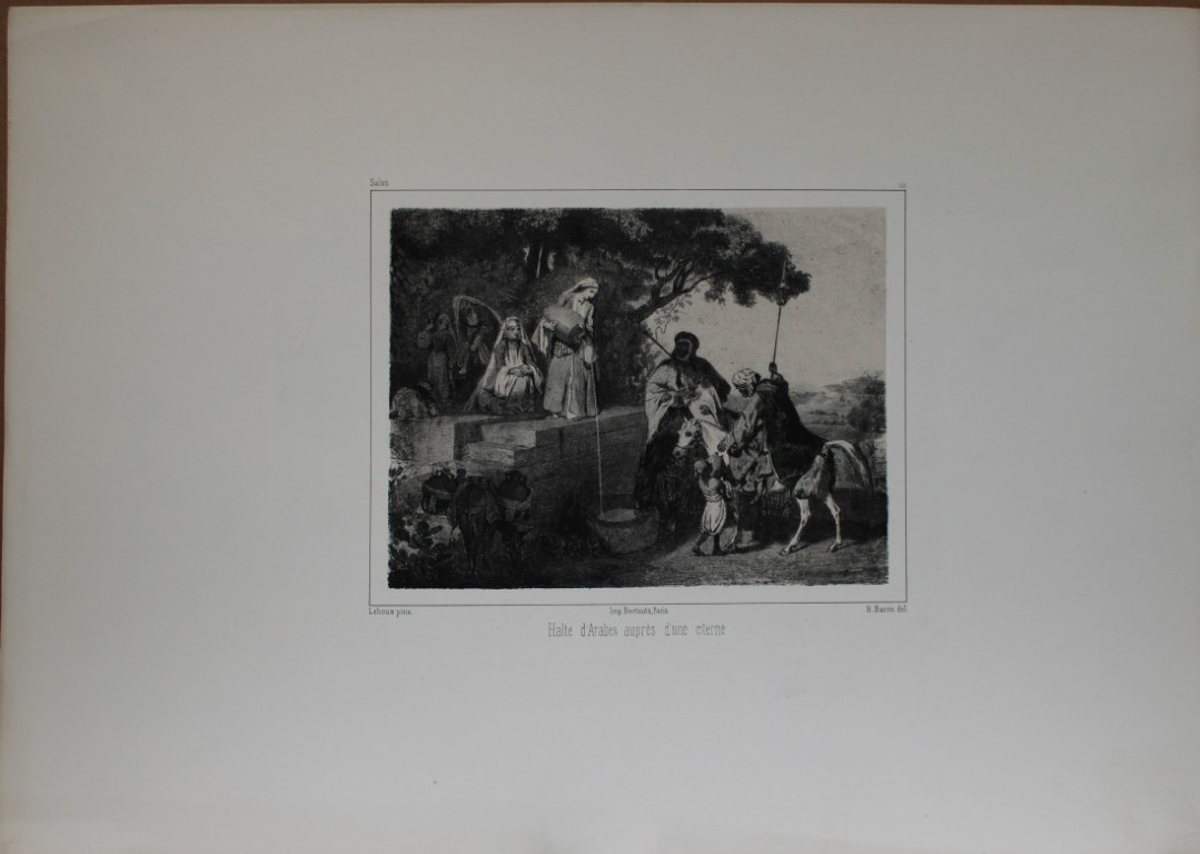 Engraving entitled Halte d’Arabes aupres d’une citerne (Arabs stop at a cistern) by Henri Baron after the artist Lehoux. Printed by Bertauts, Paris 1844.
