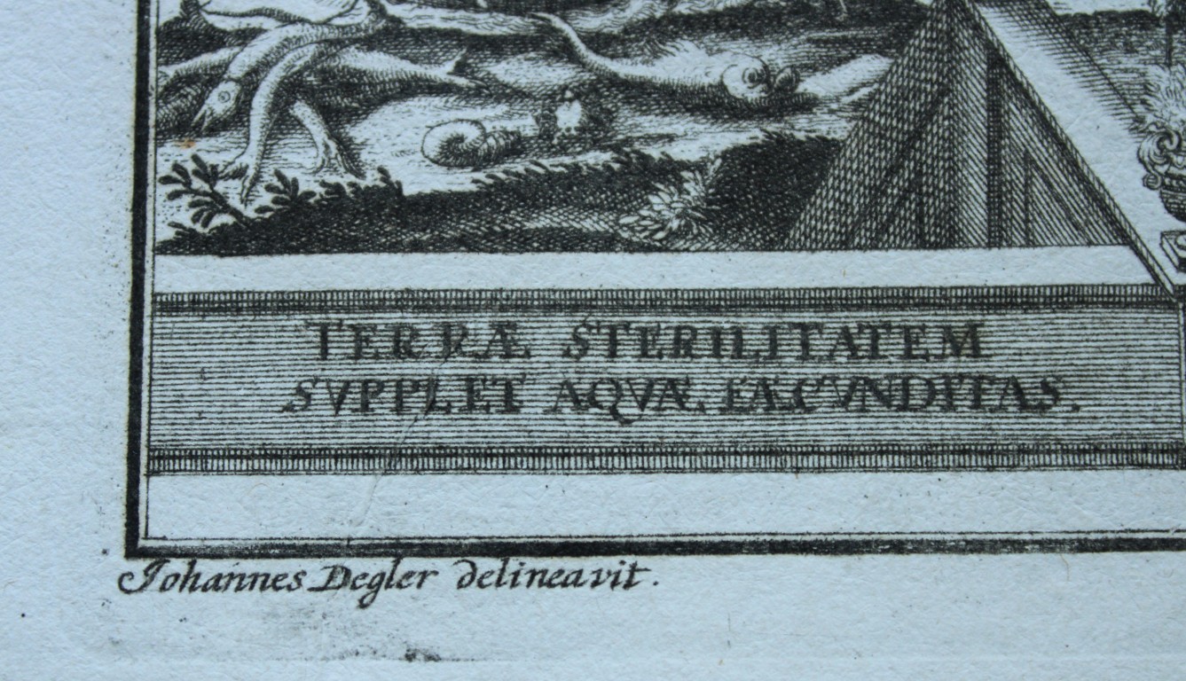 This ancient print assembles the characteristics of the Kingdom of Sweden in a single allegory. The writings highlight how the sea is so generous whilst the land is severe; so imposing is the military fleet of King Charles XII and so abundant are the fish that his fishing boats catch, but harsh is the land on which the armies fight for the few riches, such as iron mines with which weapons are forged and silver mines with which coins are minted. In the background appear the palace and churches of Stockholm.