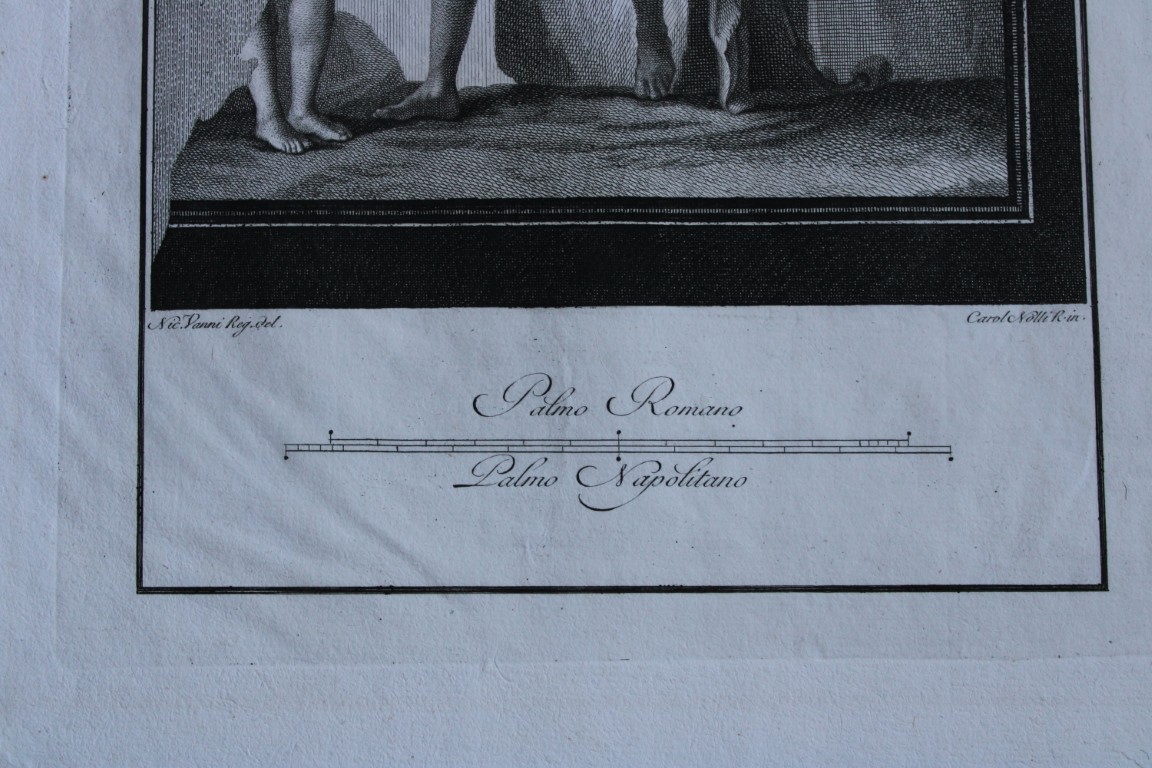 The engravings are of high quality realised by prominent artists involved by the King to prepare drawings and engravings on the finds, among which were Gio. Morghen, Carlo Nolli, Luigi Vanvitelli, Nic Oraty and Giovanni Battista Casanova.