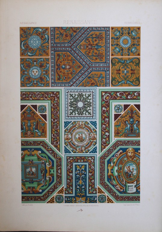 This lithographic print of decorative designs is from L’Ornement Polychrome cent planches en couleurs…. by Auguste Racinet. Published by Firmin Didot et Cie and printed by Lemercier et Cie., Paris 1873. The lithographer was F. Durin.