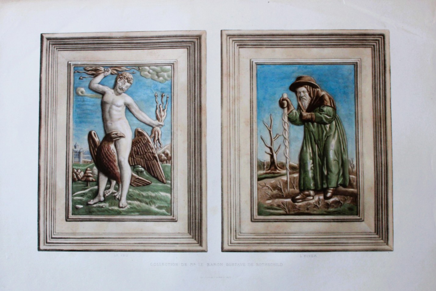 This lithograph is of Le Feu, L’Hiver, collection de Mr. le baron Gustave de Rothschild is from Monographie de L’Oeuvre de Bernard Palissy suivie d’un Choix de ses Continuateurs ou Imitateurs by M. Alexandre Sauzay and M. Henri Delange, printed by E Martinet, Paris 1862.