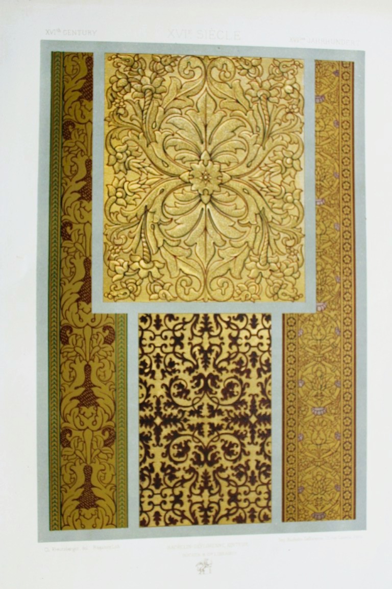 This chromolithographic print of decorative art is from Sammlung von Decorationen – Stickereien und Stoffmustern – Aus der Blüthezeit der Renaissance (Collection of Decorations – Embroidery and fabric patterns – From the heyday of the Renaissance) by M. Dupont-Auberville. Published in Stuttgart by Paul Neff 1881.
