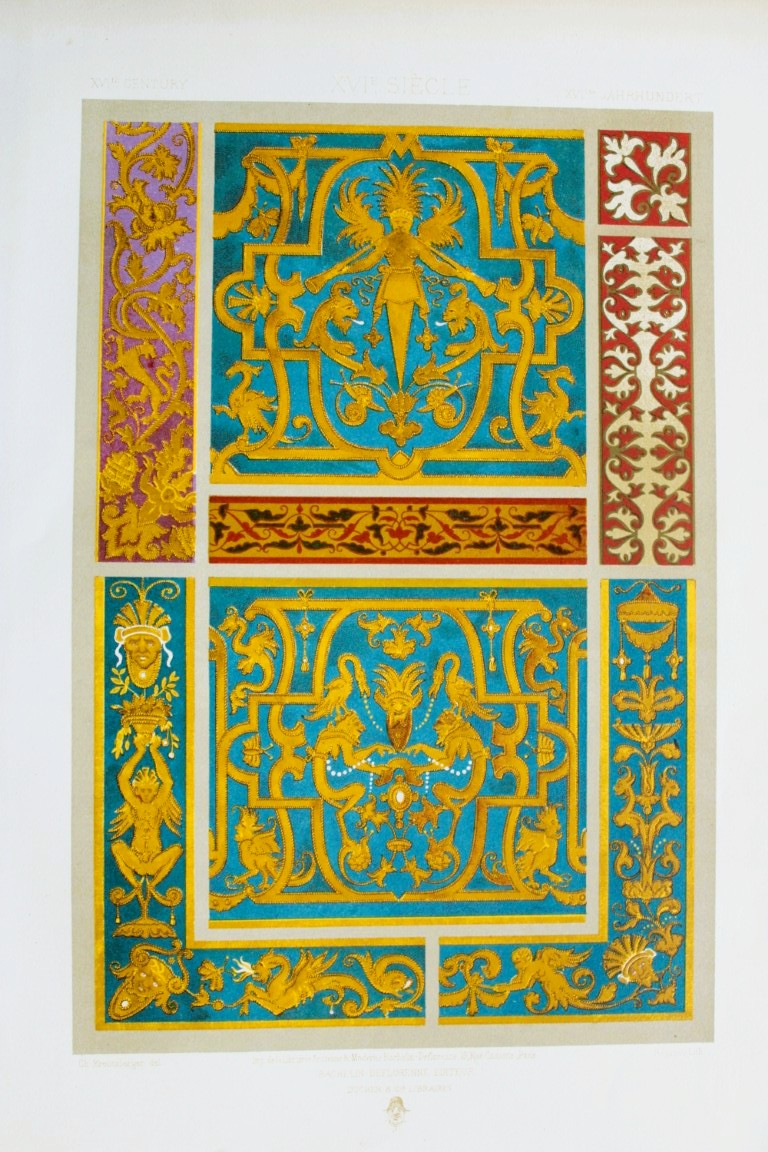 This chromolithographic print of decorative art is from Sammlung von Decorationen – Stickereien und Stoffmustern – Aus der Blüthezeit der Renaissance (Collection of Decorations – Embroidery and fabric patterns – From the heyday of the Renaissance) by M. Dupont-Auberville. Published in Stuttgart by Paul Neff 1881.