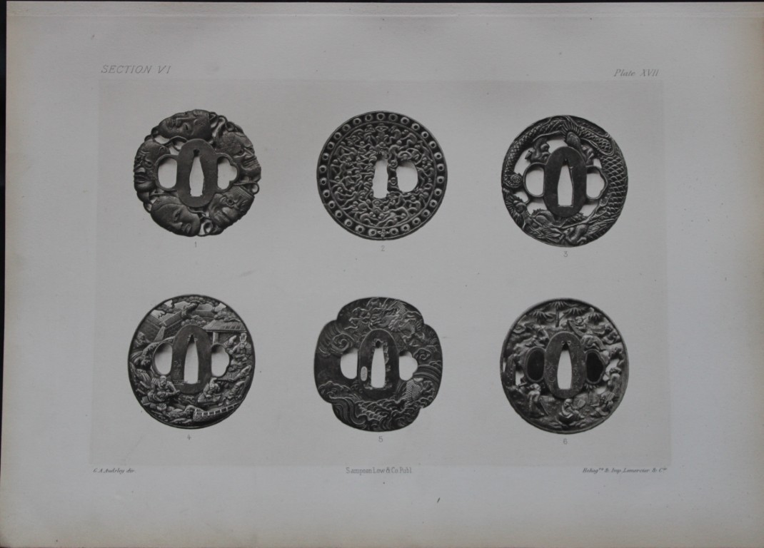 This beautiful chromolithographic print is from The Ornamental Arts of Japan by George Ashdown Audsley. 1st edition, published by Sampson Low, Marston, Searle, & Rivington, London 1882-4,