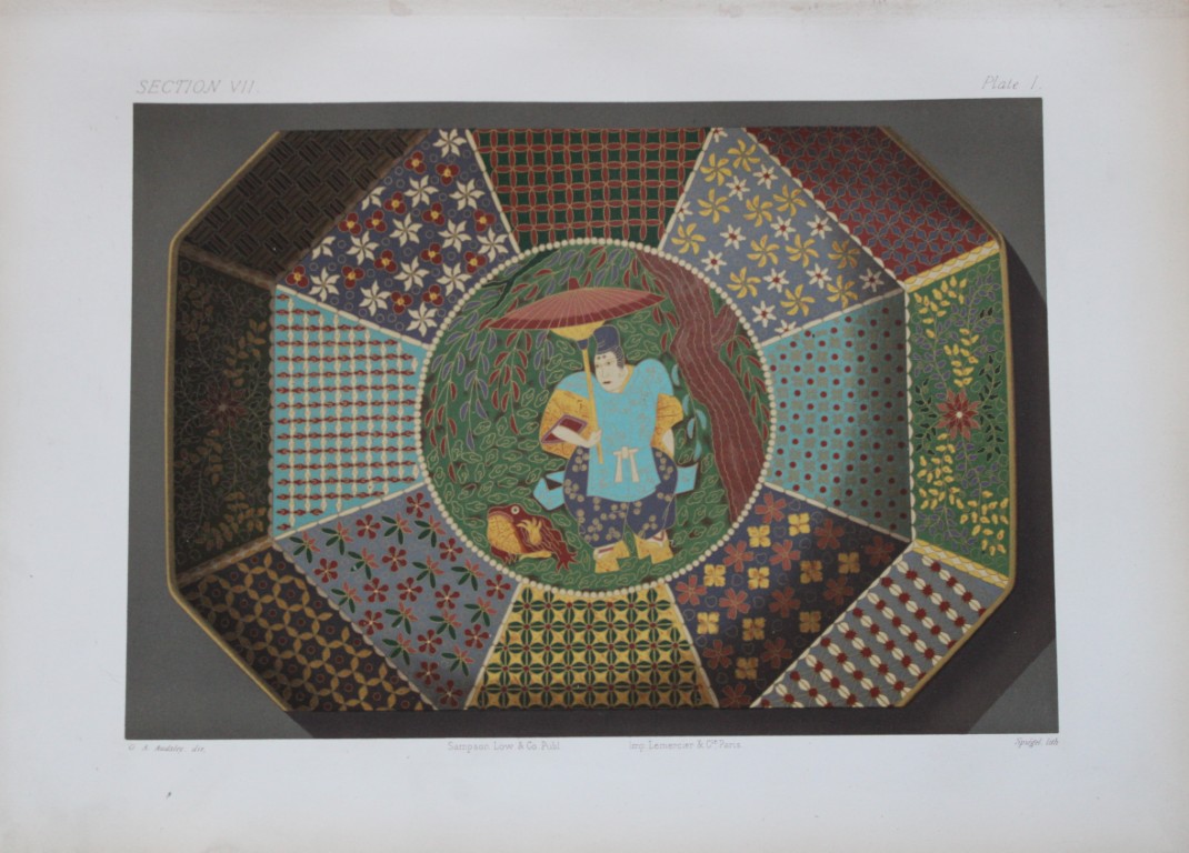 This beautiful chromolithographic print is from The Ornamental Arts of Japan by George Ashdown Audsley. 1st edition, published by Sampson Low, Marston, Searle, & Rivington, London 1882-4,