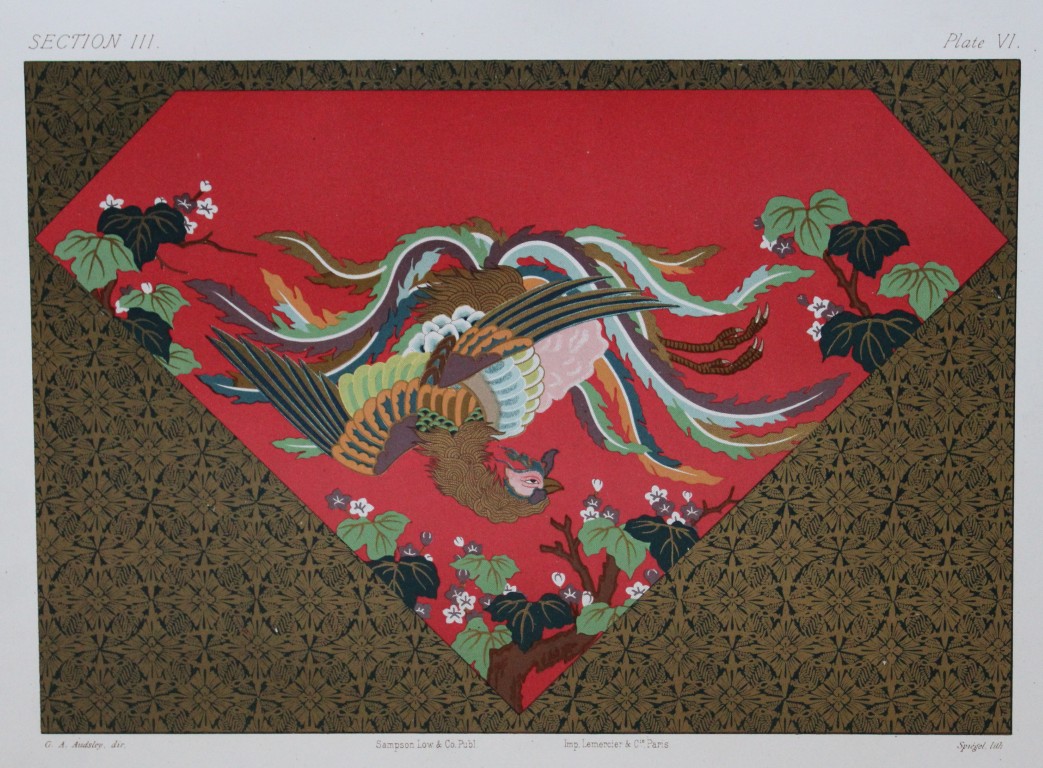 This beautiful chromolithographic print is from The Ornamental Arts of Japan by George Ashdown Audsley. 1st edition, published by Sampson Low, Marston, Searle, & Rivington, London 1882-4,
