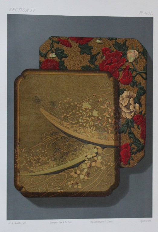This beautiful chromolithographic print is from The Ornamental Arts of Japan by George Ashdown Audsley. 1st edition, published by Sampson Low, Marston, Searle, & Rivington, London 1882-4,