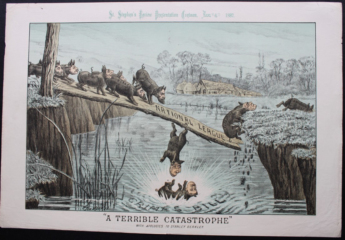Merry was a cartoonist and political satirist who created the centrespread, in colour, for The St Stephen’s Review, a weekly magazine of political comment published from 1883 to 1892. Its market was conservative, projecting a unionist viewpoint with an emphasis towards the empire and the establishment. It attacked anything that was perceived as a threat to the social and political order, depicting Parnell and Gladstone as dangerous radicals and the caricatures reflect this.