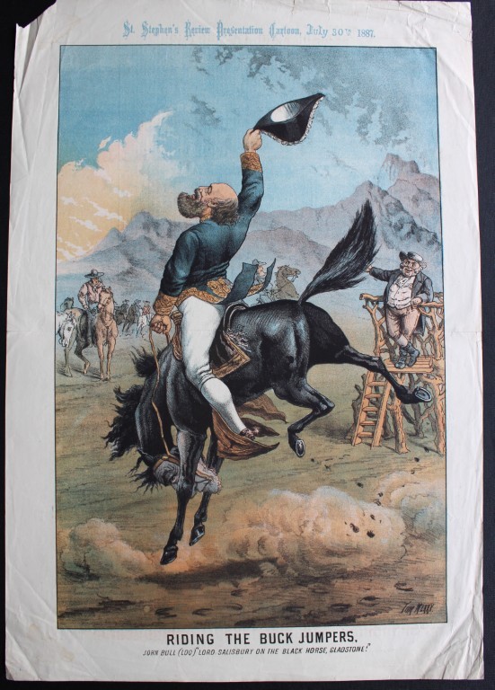 Merry was a cartoonist and political satirist who created the centrespread, in colour, for The St Stephen’s Review, a weekly magazine of political comment published from 1883 to 1892. Its market was conservative, projecting a unionist viewpoint with an emphasis towards the empire and the establishment. It attacked anything that was perceived as a threat to the social and political order, depicting Parnell and Gladstone as dangerous radicals and the caricatures reflect this.
