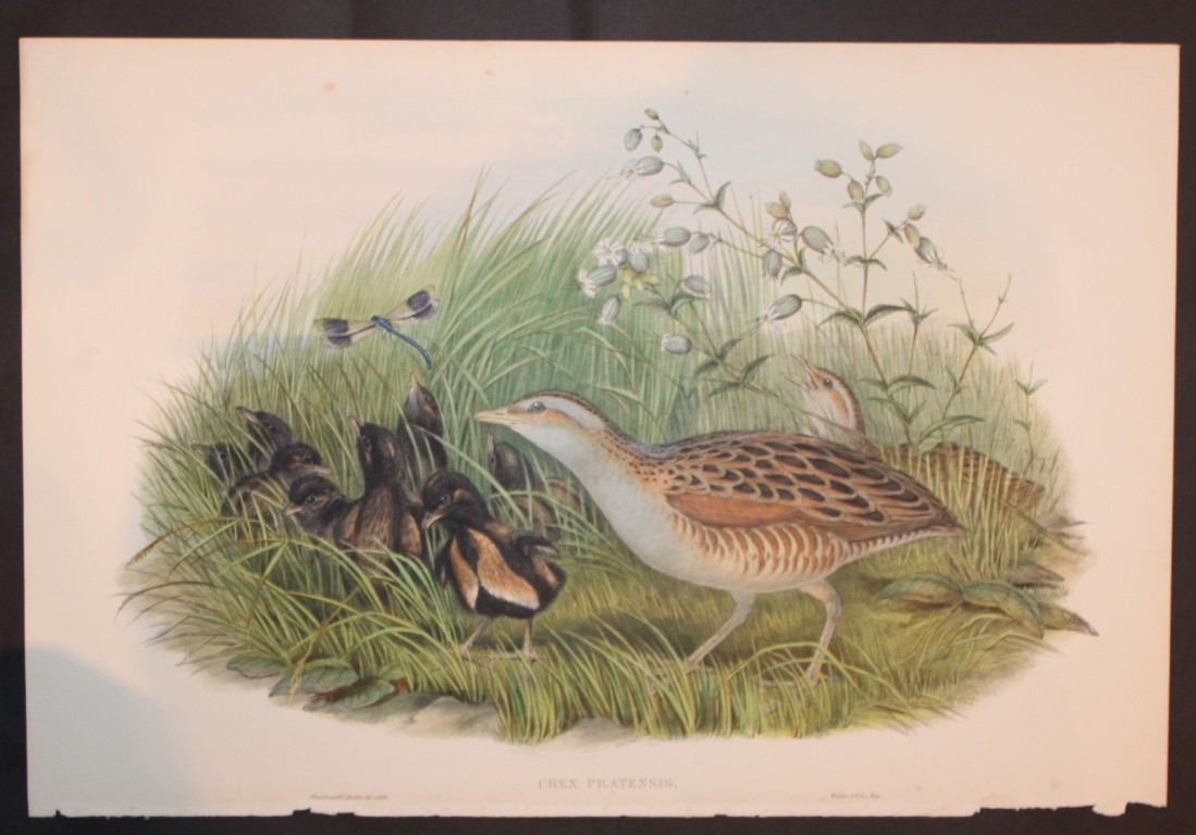 This original lithograph of the Land-rail or Corncrake (Crex pratensis ) is from John Gould’s Birds of Great Britain, issued in 25 parts between 1862 and 1873. This is plate 87 from volume 4 and was drawn and lithographed by John Gould & HC Richter.