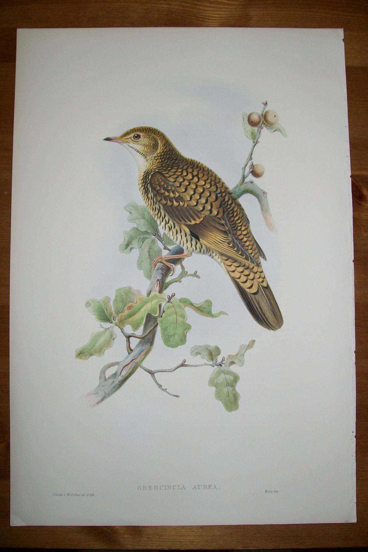 This original lithograph of the White’s Thrush (Oreocincla aurea) is from John Gould’s Birds of Great Britain, issued in 25 parts between 1862 and 1873. This plate is number 39 from volume 2 of this work and was drawn and lithographed by John Gould & HC Richter.