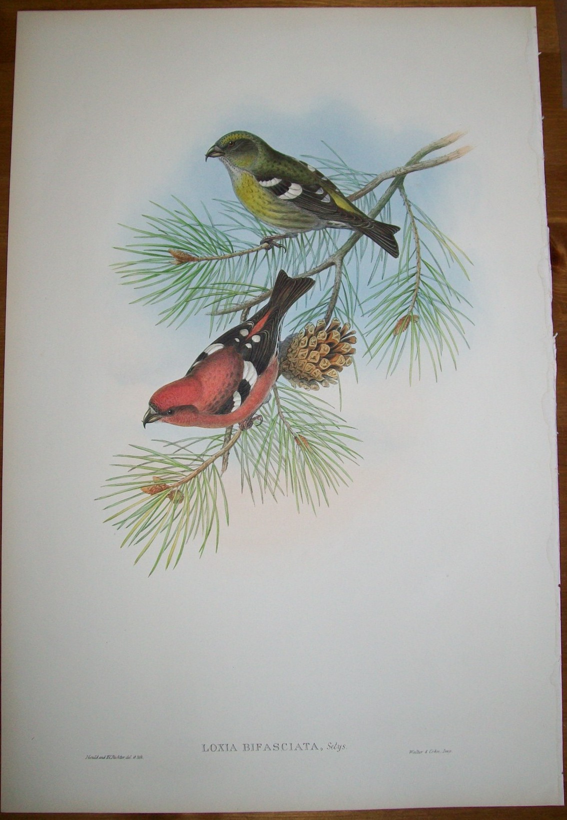 This original lithograph of the White-winged Crossbill (Loxia bifasciata) is from John Gould’s Birds of Great Britain, issued in 25 parts between 1862 and 1873. This is plate 47 from volume 3 and was drawn and lithographed by John Gould & HC Richter.