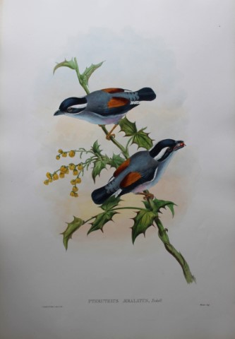 This original lithograph of the Grey-breasted Pteruthius or White-browed Shrike-babbler (Pteruthius aeralatus) is from John Gould’s, Birds of Asia issued in 35 parts between 1849 and 1883, the last three being issued after Gould’s death in 1881 by Bowdler-Sharpe.The print was drawn and lithographed by John Gould and HC Richterize: approximately 22in x 15in (52cm x 36cm)