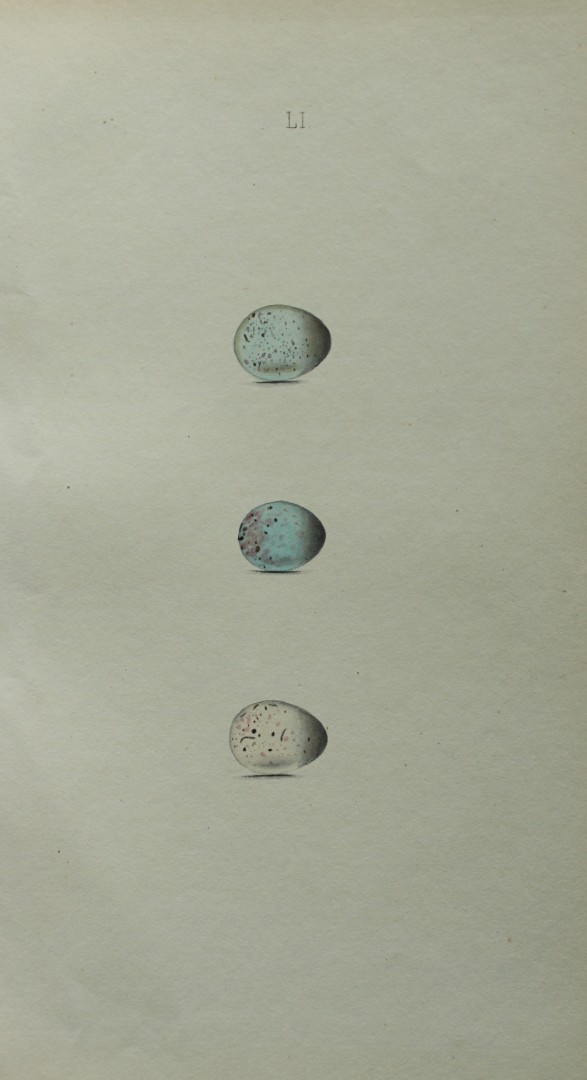 This hand-coloured engraving of bird eggs is from the Coloured Illustrations of the Eggs of British Birds accompanied with descriptions of the Eggs and Nests by William C Hewitson, published by Jan Van Voorst, London, 1856.