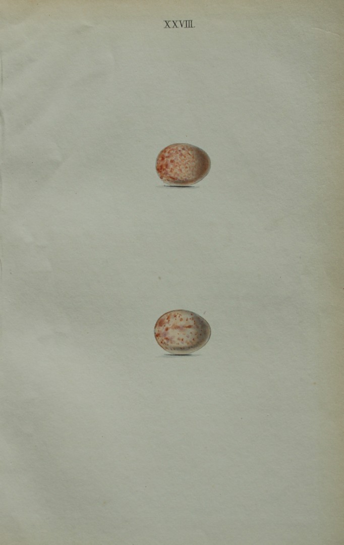This hand-coloured engraving of bird eggs is from the Coloured Illustrations of the Eggs of British Birds accompanied with descriptions of the Eggs and Nests by William C Hewitson, published by Jan Van Voorst, London, 1856.