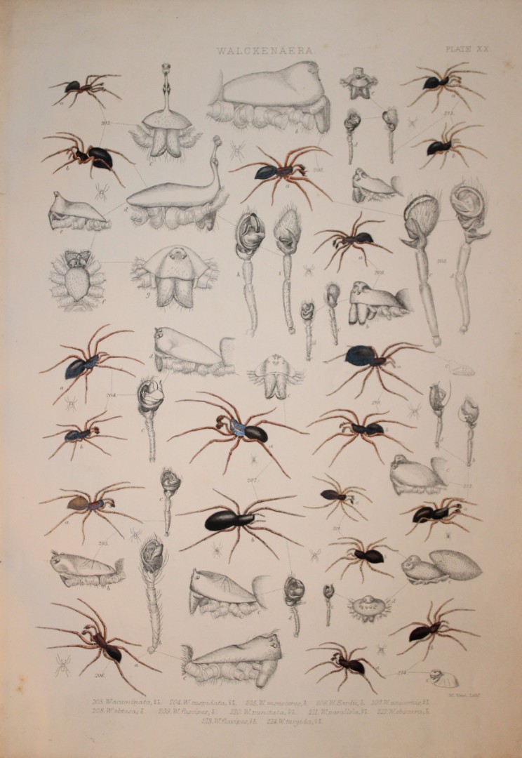 This hand-coloured lithograph is from A History of the Spiders of Great Britain and Ireland by John Blackwall. First edition published for the Ray Society by Robert Hardwicke, Piccadilly London1864.