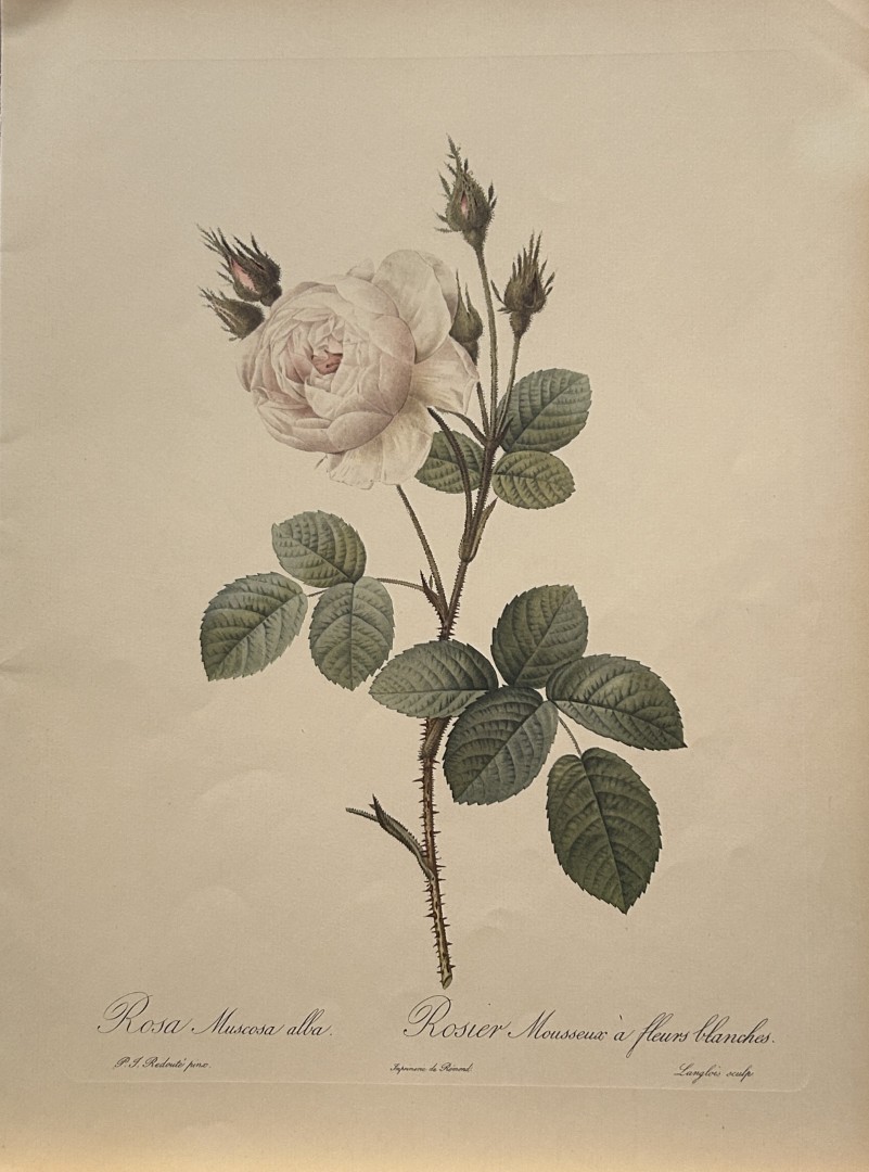 This print, originally drawn by Pierre-Joseph Redoute is from Roses 2, edited and selected by Eva Mannering. Published in London by Ariel Press, 1956. First Edition.